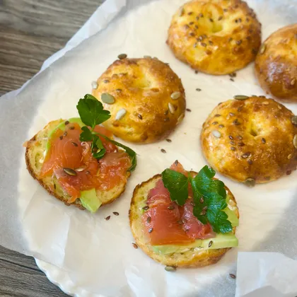Смазываем бейглы яичным желтком, посыпаем семечками, затем отправляем в духовку, разогретую до 180 C, в режиме «верх‑низ» или конвекция.