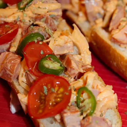 Разрезаем булочки или чиабатту вдоль пополам. Смазываем майонез или кетчупом или и тем и другим, далее курочка / колбаска / ветчина, далее овощи любые по желанию, кружочки перца чили, зелень, тёртый сыр любой или кубики моцареллы. В духовку на 5-8 мин при температуре 200 градусов до приятной золотинки.