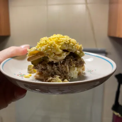 - выкладываем 1/3 часть крекера, затем белок с майонезом, крекер, помятую вилкой консерву, огурцы, затем снова крекер, слой сыра с майонезом