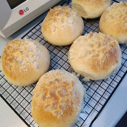 Перед выпечкой смазать булочки яйцом или молоком и присыпать штрейзельной крошкой.