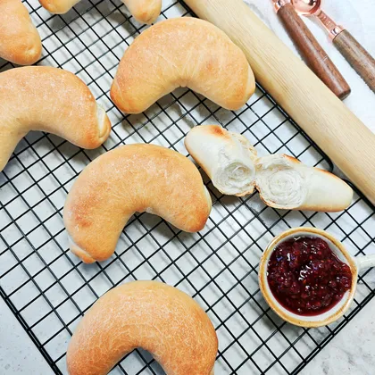 Духовку разогрейте до 240 градусов. Поставьте противень с рогаликами в середину духовки, уменьшите температуру до 230 и выпекайте 12-15 минут до золотистого цвета.