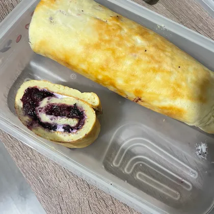 Блину дать остыть. Он должен быть теплым, но не горячим. Снять с пергамента. Распределить крем, сверху начинку, скрутить рулетом по длинной стороне.