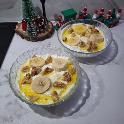 Собираем десерт в креманки. Слой творога - банан с орехом и опять творог, банан с орехом.