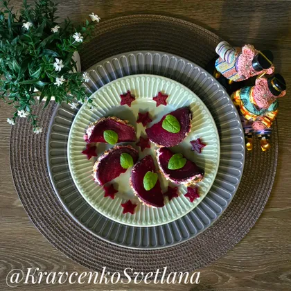 На половинку свекольного кружка выкладываем начинку, складываем пополам, края обмакиваем в измельченный грецкий орех.