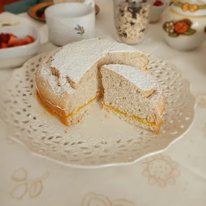 Остывший пирог разрезать на две части и смазать кремом. Украсить сахарной пудрой. Приятного аппетита.