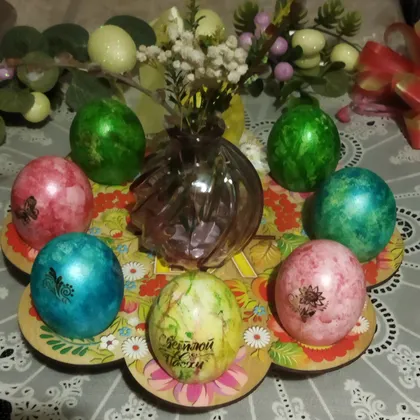 Надеть перчатки, перекатать между ладоней яйцо с каплями красителя, чтобы он равномерно распределился по поверхности скорлупы, поместить на подставку. Перед применением другого красителя перчатки промыть, обсушить!