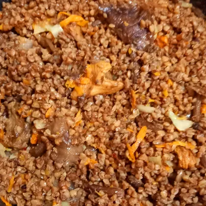 Добавьте к зажарке отваренную гречку. Перемешайте, прогрейте всё в течение пяти, семи минут на медленном огне.