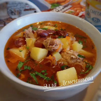 В кипящую воду выложить нарезанный кубиками картофель, тушёнку и фасоль (с жидкостью).