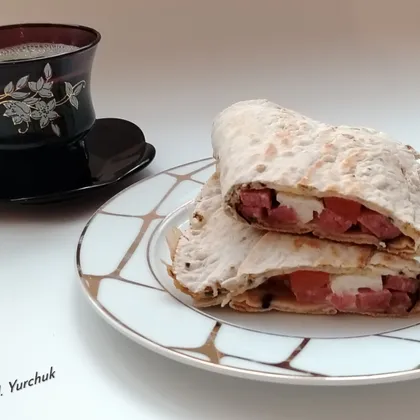 Сверху на яйцо выложить круглый лаваш, придавить и обжарить 2-3 минуты на среднем огне.