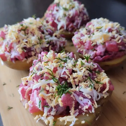 Готовые картофелины разрезать пополам, аккуратно ложкой вынуть сердцевину, чтобы получились "лодочки".