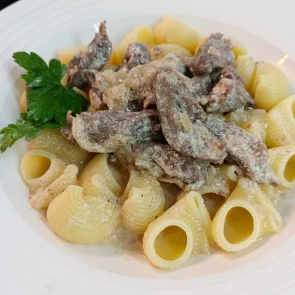 Пока готовится соус, отварите макароны до состояния al dente (обычно 7-10 минут). Откиньте готовые макароны на дуршлаг и подавайте с сердечками, посыпав зеленью.
