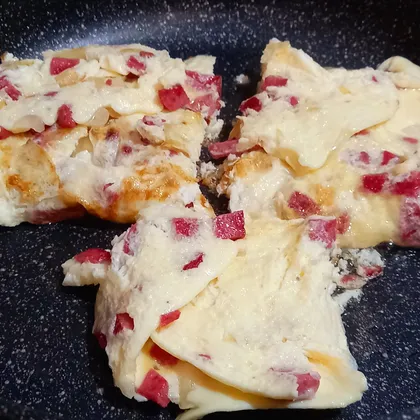 Накройте сковородку крышкой, жарьте омлет до полной готовности.