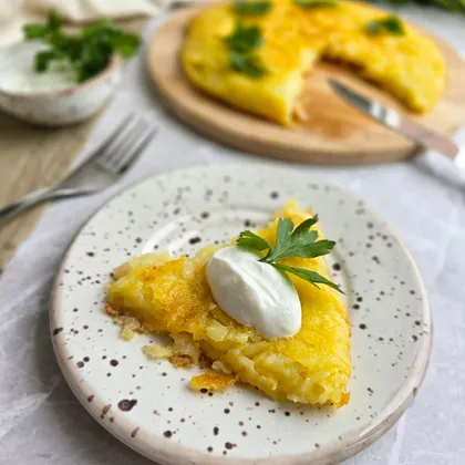 Когда одна сторона будет готова, накрыть сковороду большой тарелкой и перевернуть на неё рёшти, затем вернуть его обратно на сковороду и жарить другую сторону также до золотисто-коричневого цвета, около 20 минут.