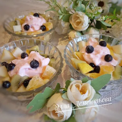 В миску выложить смородину (у меня замороженная) и нарезанные апельсин, грушу и киви. Перемешать.