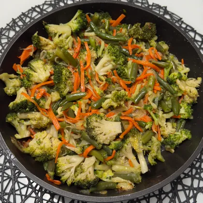 🗯️добавить брокколи и фасоль к остальным овощам, подсолить, поперчить, добавить 50 мл. водички и протушить под крышкой, пару раз помешивая около 5 минут.