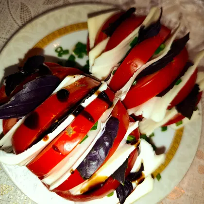 Сбрызгиваем оливковым маслом, солим, посыпаем сушеным базиликом, поливаем бальзамическим соусом. Количество ингредиентов увеличить по желанию. Приятного аппетита!🌹
