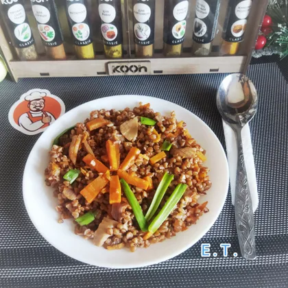 По окончанию готовки сковороду с готовой гречкой оставить на плите.