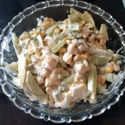 Добавляем консервированную кукурузу, натёртый на мелкой тёрке или пропущенный через чеснокодавилку чеснок, нарезанный укроп.