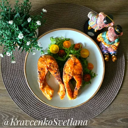 Рыбу нарезаем порционными стейками, пересыпаем специями и солью.