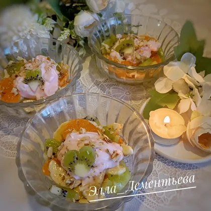 На фрукты выложить йогурт и посыпать измельчёнными ножом орехами.