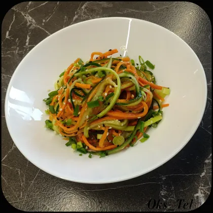 К моркови добавить огурцы, полить приготовленной пикантной заправкой, все аккуратно перемешать и убрать салат в холодильник на 30 мин.