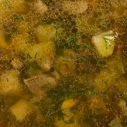 В кастрюлю добавляем воду. Ставим кастрюлю на огонь и варим содержимое до готовности картофеля. После этого добавляем содержимое сковороды в кастрюлю и варим еще минут 5. В самом конце добавляем отложенную ранее зелень из тарелки - буквально за минуту до того, как снимем суп с огня, чтобы эта зелень была в готовом супе зеленой и не размякла. Снимаем готовый супчик с огня.