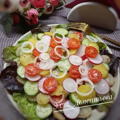 На плоское блюдо выложить листья салата. Вперемешку картофель и нарезанные кружочками помидоры, огурцы, редис и лук.