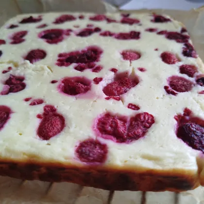 Смешайте яйца и сметану, сахар и другие ингредиенты. Творог добавляем в конце. Когда все перемешали застилаем форму пергаментом и выливаем наше тесто. Сверху украсим малиной.