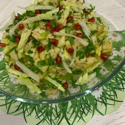 Разобрать гранат и добавить зерна в салат, а также зелёный лук, зелень, заправить растительным маслом, перемешать. Салат готов! Приятного аппетита!
