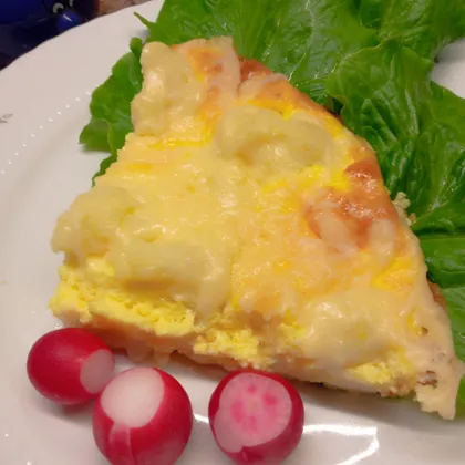Форму для запекания смазать сливочным маслом, выложить цветную капусту, залить омлетной массой и поставить в разогретую до 200 °С духовку, дать запечься минут 10-15, почти до готовности.