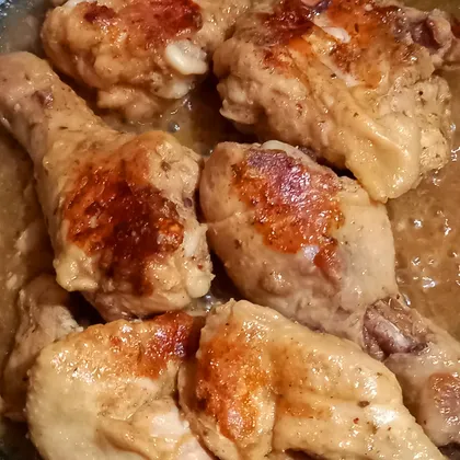 Куски куры посолите, сдобрите специями для курицы, полейте соевым соусом, перемешайте. Обжарьте куски курицы до румяной корочки с одной стороны, переверните, добавьте воду.