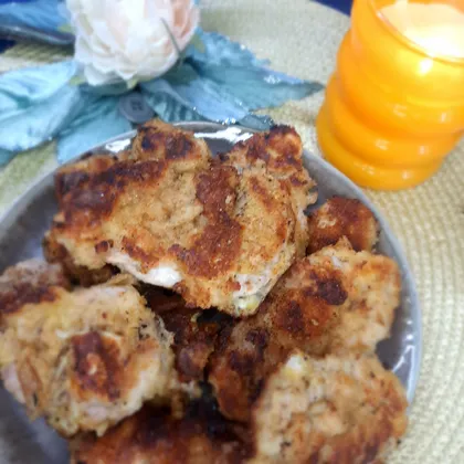 Каждый кусок обвалять в муке, далее в яйце, далее в панировочных сухарях.