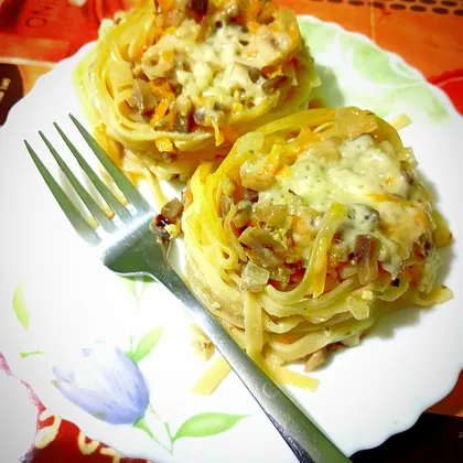Заполнить гнездышки жареными грибами с овощами.