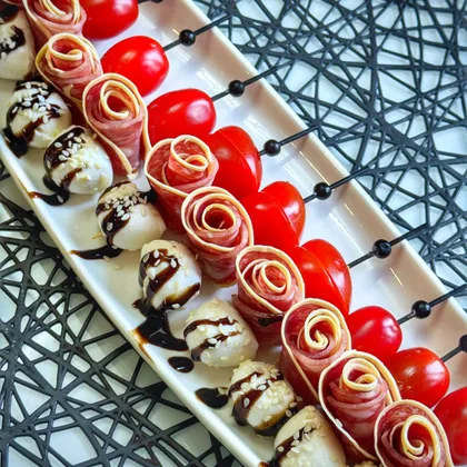 На шпажку нанизать помидор черри, розочку из колбасы и шарик моцареллы.