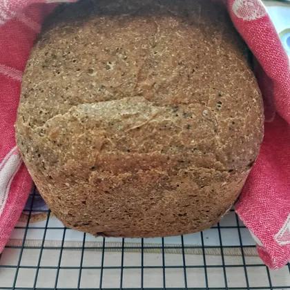 После сигнала окончания программы, хлебопечь отключить. Остудить немного не вынимая чашу с хлебом. После этого достать. Выложить хлеб на решётку. Остудить под полотенцем.