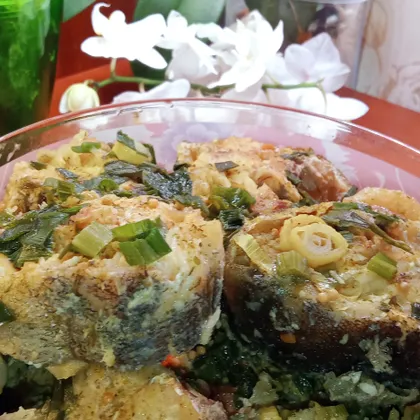 Лук промыть, мелко порубить и посыпать рыбу луком. Оставить ещё на плите 5 мин. до готовности. Приятного аппетита!