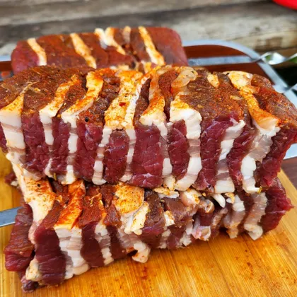 Нарезать мясо тонкими продольными пластами, примерно по 1 см. Также нарезать и грудинку. Мясо предварительно немного заморозить, чтобы было удобно резать.