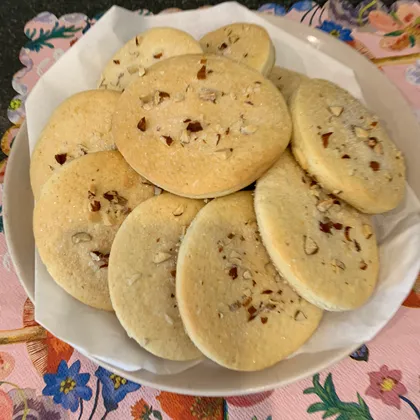 Замешиваем мягкое тесто, убираем в полиэтиленовый пакет на 15-20 минут. Затем раскатываем пласт толщиной примерно 1 см, вырезаем формой лепёшки, кладём на противень, покрытый пергаментом, смазываем растительным маслом, посыпаем измельченным миндалем и сахаром.