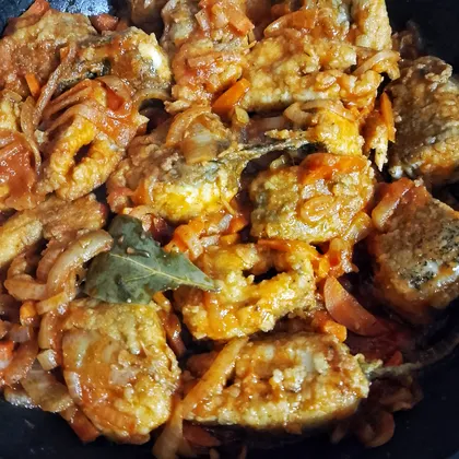 Влить воду, добавить лавровый лист. Довести до кипения и выложить обжаренную рыбу. Томить переворачивая 10 мин.
