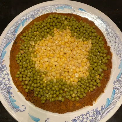 Вынуть форму, дать немного остыть, чтобы пирог немного отошел от формы. Перевернуть пирог в блюдо. Присыпаем пирог через ситечко куркумой и обильно украшаем горошком и кукурузой (бульон из банок сливаем). Чтобы горошек и кукуруза не скатывались с пирога, ладошкой их вдавливаем в пирог - пока он теплый, он очень мягкий, в него всё легко вдавливается.