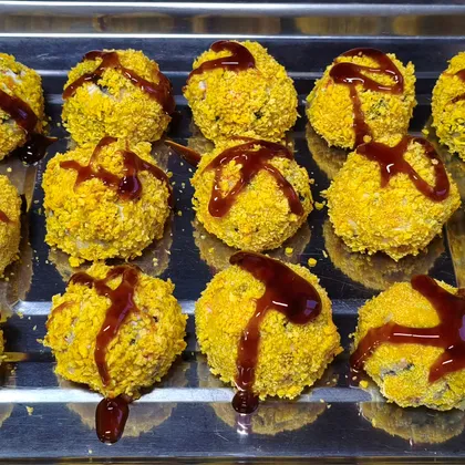 Окунаем каждый шар в яйцо, затем в панировку и выкладываем на противень застеленный пергаментом. Можно запекать аэрогриле.