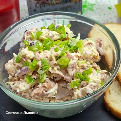 В конце добавьте консервированного тунца и немного майонеза, закуску посолите и поперчите по вкусу. Для рецепта подойдет любой тунец - в масле или в собственном соку. Только перед добавлением тунца - слейте всю жидкость.