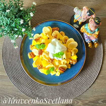 Выкладываем на блюдо, сверху выкладываем орехи и йогурт.