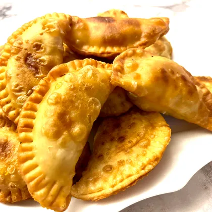 Тесто тонко раскатать, вырезать круги, выложить на одну половину начинку, накрыть второй половиной теста и края прижать вилкой.