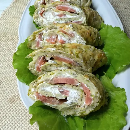 Закусочный рулет из кабачка с малосольной рыбой
