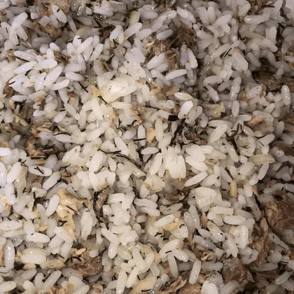 Рыбу и рис перемешать. Добавить мелко нарезанный лук и зелень, у меня укроп. Добавить растительное масло и перемешать.