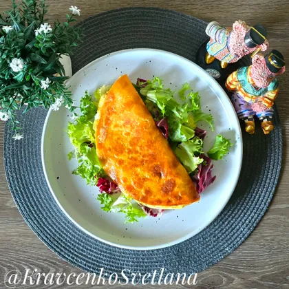 На разогретую сковороду, выливаем яичную смесь, сверху кладем тортилью.