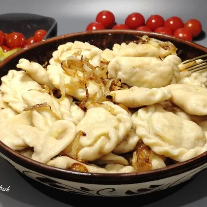 Сварите вареники. В кастрюле доведите воду до кипения, немного её посолите и выложите вареники, перемешайте, чтобы они не прилипли ко дну кастрюли. После того, как вареники всплывут, варите их еще 5 минут и доставайте шумовкой. Можно при подаче посыпать обжаренным луком. Подавайте к столу горячими. Готовьте с любовью и приятного аппетита!!!!