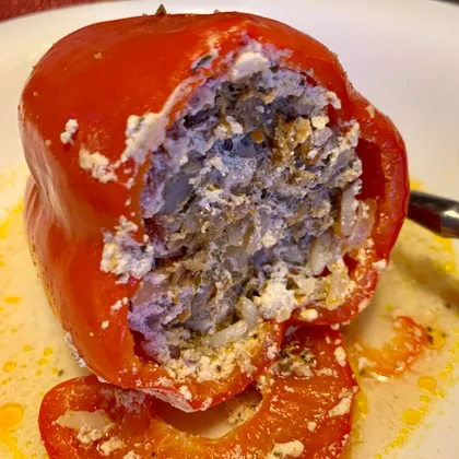В миске смешиваем фарш, полуготовый рис и обжаренные лук с морковью. Выдавливаем чеснок через пресс. Солим, перчим, добавляем специи (у меня паприка, сухие укроп и петрушка). Тщательно перемешиваем фарш до однородности. Начиняем перцы фаршем примерно на 3/4. Слишком плотно не утрамбовываем так, как рис будет развариваться и ему нужно место.