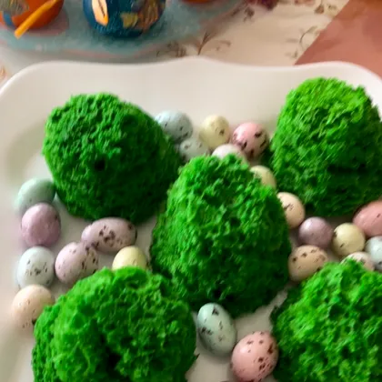 Затем стаканчики разрезать, вынуть мох, раскрошить и украшать куличи и прочие кондитерские изделия.
